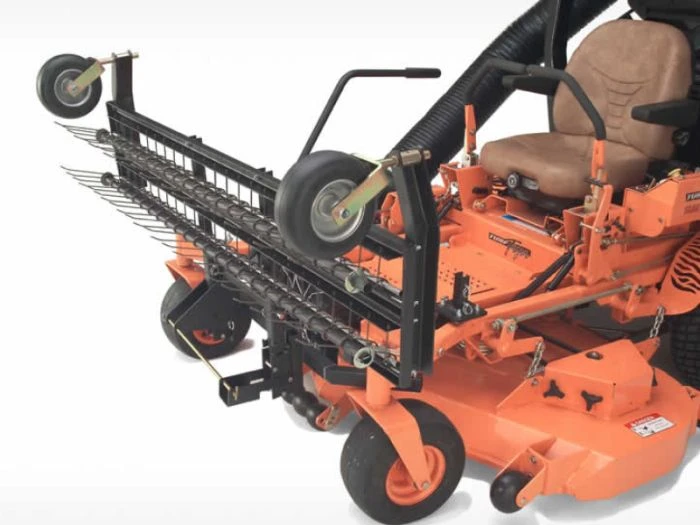 - The stabilizer tube through the lower loop of the patented double loop tines maintains tine spacing, allowing zero-turns without lifting the rake or damaging turf.